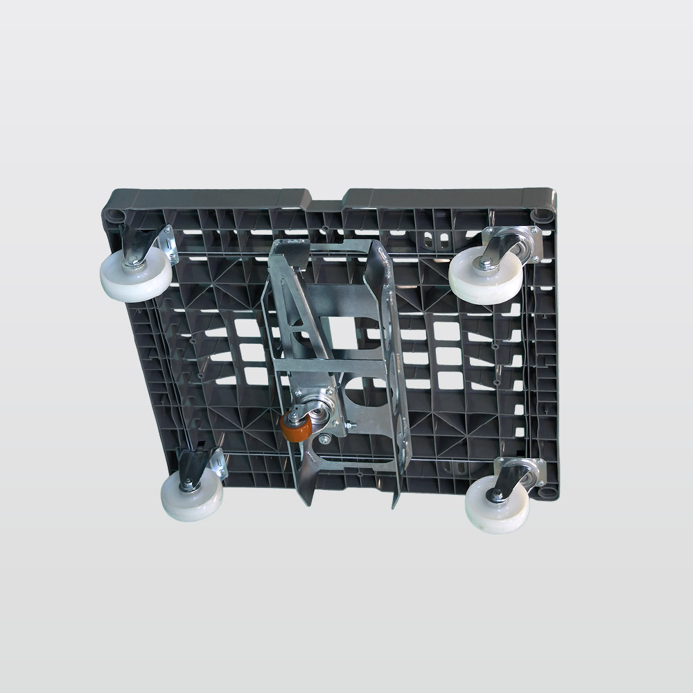 Durch einen einfachen Pedaldruck auf den Hebel lässt sich das in alle Richtungen bewegliche Rad nach unten drücken und entlastet die beiden feststehenden Bockrollen des Roll-Containers. Somit lässt dich der Roll-Container mühelos quer zu seiner eigentlichen Fahrtrichtung verschieben.